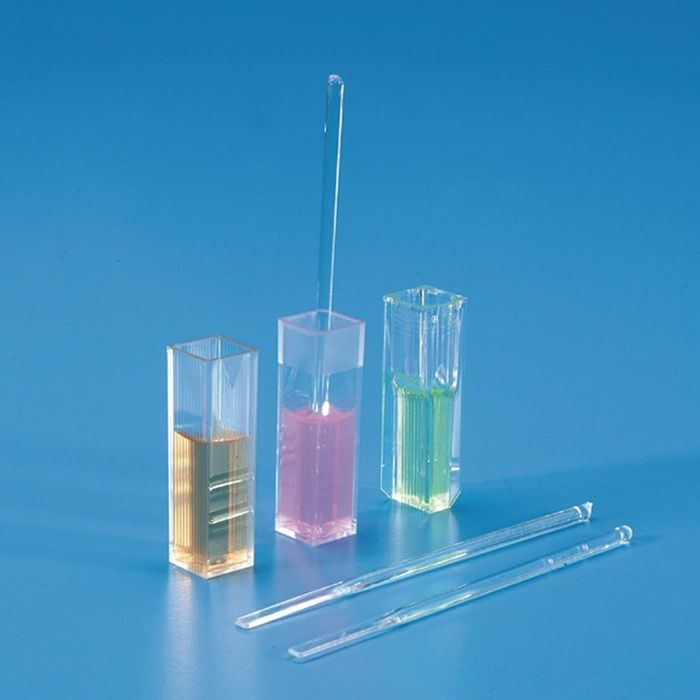 Cuvettes for spectrophotometry application in visible spectrum. Clear and sharp optical path with indication of optical path direction. They are made of optical PS an UV grade PMMA and are equipped with optically machined walls (optical faces) to ensure optimal transparency along the spectral field from 340 to 800 nm (optical PS) and from 280 to 800 nm (UV grade PMMA). Available in the macro version (4.5 ml), low-form semi-micro (1.5 ml), high-form semi-micro (2.5 ml), with 2 or 4 optical faces. The two optical face version has grooves on the two walls not optically machined to provide better grip and to prevent positioning errors. They are compatible with most of the spectrophotometers and photometers on the market. The production technology and quality control determine reproducibility of the cuvettes. The absorption changes are kept within the ±1% interval, an extremely important condition especially for analyses in series. The cuvette Art. 1961, with 4 optical faces and usable in the UV field, can be used for spectrofluorimetric techniques. It is recommended for most of the common biological and biotechnological applications. They are packaged in a practical dust-proof support-container made of PS foam containing 100 cuvettes.