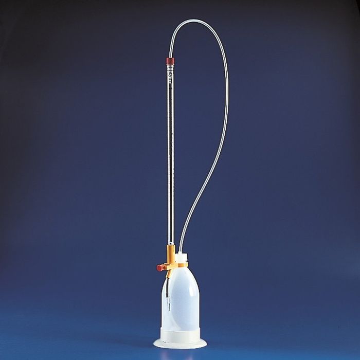 Automatic plastic Schilling burettes (according to DIN 12.700 standards, Class B). With push button for drop by drop delivery. PE reservoir with stable PE-LD base.