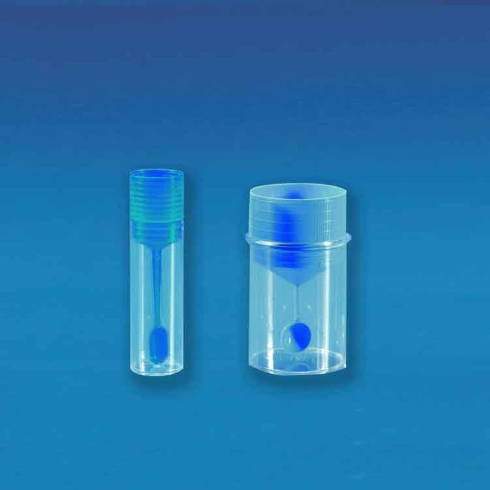 Particularly designed for collection and delivery of faeces. Made of transparent PS with stopper of PP, incorporating a small spoon to facilitate sample handling.