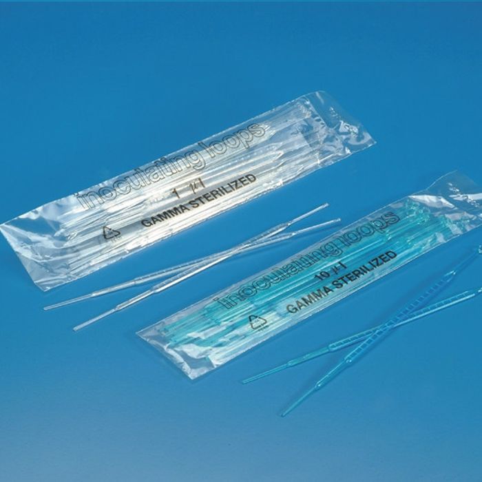 Sterile inoculating loops in polybags of 20 pcs. Natural type has a 1 µl loop at one end and a needle at the other. Blue type has a 10 µl loop at one end and a needle at the other.