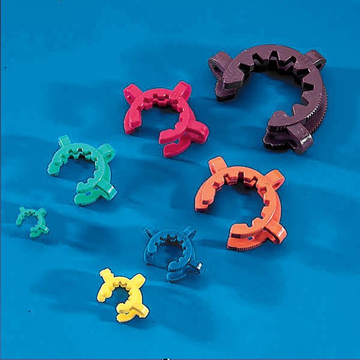 Plastic clamps for safe connection of standard-finish glass conical joints. Corrosion proof, do not scratch glass. Available in various colours according to dimensions. Autoclavable.