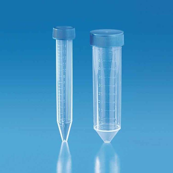 15 and 50 ml graduated conical test tubes supplied with red PP tight screw cap. Can withstand temperatures up to - 80⁰C to + 121⁰C. Tubes are supplied in packs of 150 (15 ml) and 100 (50 ml) respectively.