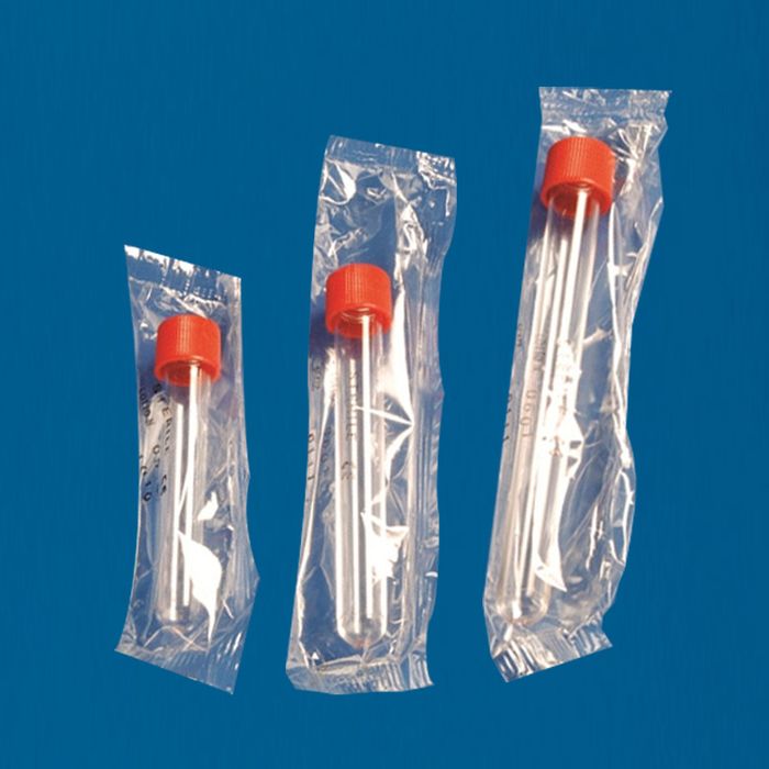 Disposable test tubes with tight screw caps, individually packaged sterilised.