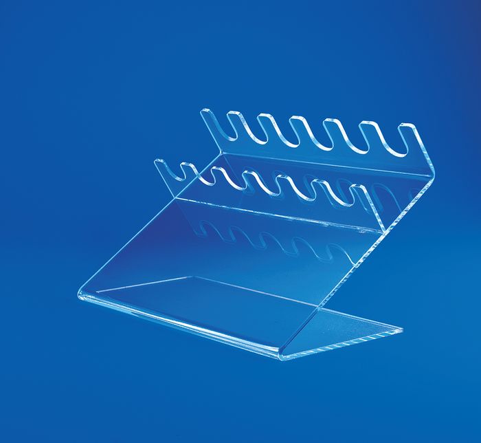 Bench holders in transparent plastic material for 3 to 6 KARTELL micropipettes (Pluripet, Pluripet II, Fixopet, Labofix) or other brands. Strong structure, easy cleaning, wide base allowing great stability. Radiation sterilisable.