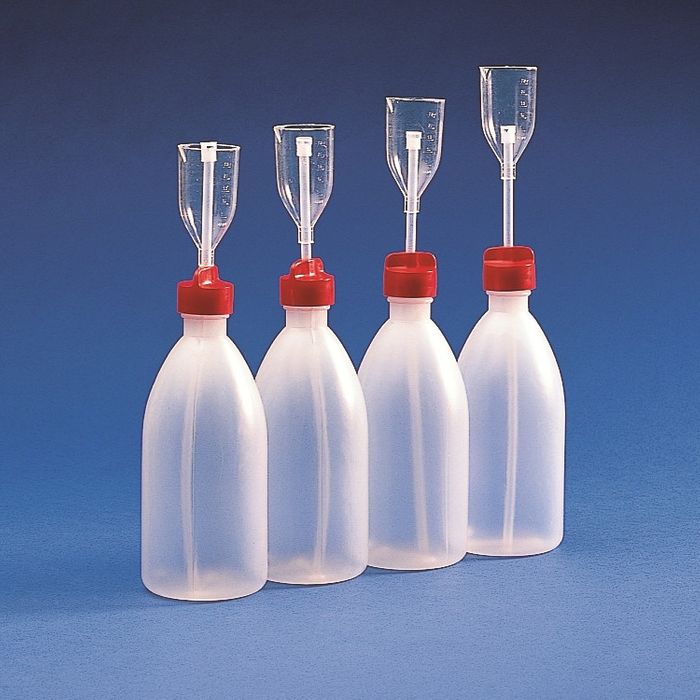 The graduated clear PMP measuring cup slides up and down the tube and the variations in height changes the volume remains to be dispensed. The dispensed volume remains constant at any present position of the cup. The cup is filled by squeezing the bottle and forcing the liquid up the tube When the bottle pressure is released, the excess will be drawn back into the bottle and only the desired volume will remain.