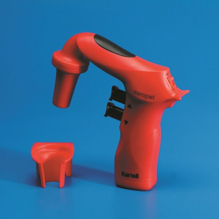 Seropet was developed for aspirating liquids by glass or plastic pipettes ranging from the volume of 1 ml up to 100 ml. The particularly light structure ensures comfortable use even when used for a long time and its particular configuration also makes it ideal for underhood uses. The buttons are very easy to access for choosing different modes depending on the volume pipette being used and viscosity of the liquid to aspirate. It is protected from crossed contamination in the event of excessive aspiration by the filter on the aspiration device and the safety valve. It is supplied complete with battery charger, protective PTFE hydrophobic filter (0.2 µm) and an adhesive support for attachment to the laboratory bench. EC/IVD-compliant.