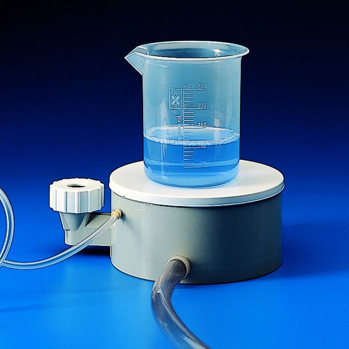 This unique stirrer is operated either by water pressure between 1 and 2.5 Kg / cm2 (15 to 40 psi) or by air pressure. No electric supply is needed thus eliminating heat, shock and explosion hazard. Corrosion proof all plastic construction. Can be used on the bench or clamped to a stand with 12 mm (1/2") diameter (Art. K-267). Supplied complete with tubes.