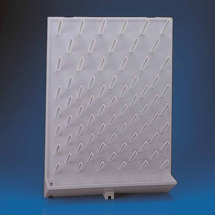 The back plate of the 72 place support is made from a single mould of 4 mm rigid HIPS. The peg sockets have closed ends eliminating leakage and consequent biohazards. The seamless drip channel collects waste which drain via drain tube provided. 72 push in pegs which can accommodate items with "neck" bore in excess of 15 mm are supplied and 11 small pegs of diameter 6 mm for small diameter items such as test tubes. They are easily removeable for cleaning or to accommodate particularly shaped items. This rack will not stain or rust. Comes complete with moulding kit, draining hose, and fixing template. Additional racks can be joined together to make a bank of racks, using the joining plugs provided. Supplied with draining kit (connector + tubes). Discharging tube: internal 11mm, external 13 mm.