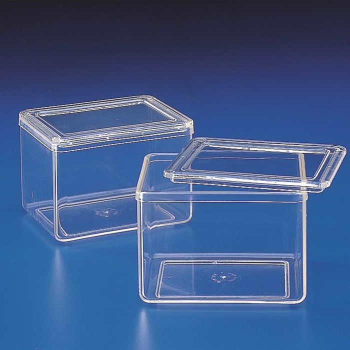 Moulded in TPX for use with Art. 354. Supplied with 2 lids - one lid for use when dish is not in use, providing evaporation-free storage of staining liquid - the other lid with special opening to allow handle of staining rack Art. 354 to be inserted; Xylene can cause etching after 2 days at room temperature.
