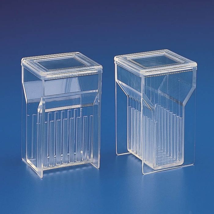 TPX staining jar holds 76 x 26 mm microscope slides vertically. Eight grooves. Supplied with TPX cover. Can accommodate 16 slides back to back. Xylene can cause etching after 2 days at room temperature.
