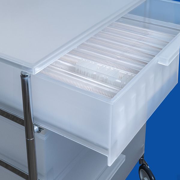 Slide storing system designed for the classification and storage of microscope slides made of high impact PMMA and steel. The semi-transparent ice colour gives an attractive appearance while the metal structure makes it stable, while ensuring the value of lightness, functionality, strength and durability. It is composed of 4 sliding drawers, a closing cover and four swivel castors to guarantee mobility. Each single drawer can hold up to 13 supports for slides (Art. 921) and transparent cover plates (Art. 920), to be ordered separately. Each slide support can contain 100 microscope slides, easily extractable. Each cavity is numbered. The transparent lids guarantee an easy check of the contents, protecting the slides from dust and other foreign bodies. The complete Storing System can therefore contain up to 5,200 slides.