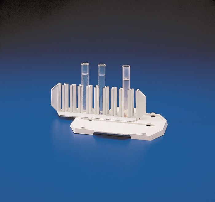 Base plate that can hold two of Art. 130 - 135 series test tube racks in the slots provided. Useful for colorimetric analysis and to stock standard samples.